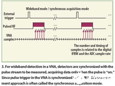 宽带检波适合多数脉冲RF谱落在VNA的接收器带宽范围内这种情况,可用模拟电路或数字信号处理(DSP)技术实现。对于宽带检波,VNA的各接收检波器与脉冲流同步,仅在脉冲处于“开”状态时,才进行数据采集。因为这一方法包含一个同步到PRF的脉冲触发器,用以触发分析仪,所以常常称作同步采集模式(图3)。这种模式下的时间分辨率是接收器检波带宽的函数。确定近似时间分辨率的一个好方法是使用带宽的倒数,即1/BW。