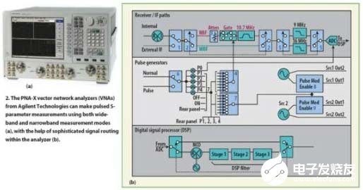 安捷伦公司的Agilent PNA-X系列VNA能够提供脉冲激励,并可精确测量脉冲响应。此高度集成的S参数测量系统(见图2a)的内部信号布线复杂(见图2b),能产生并分析CW和脉冲激励响应。内部测试信号发生器由内部源调制,产生10MHz~26.5GHz频率的激励脉冲。
