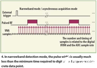 在窄带检波模式中,脉冲宽度通常比数字化并获取一个分立的数据点所需要的最短时间要小得多(见图4)。有了这个技术,除中心频率成分外的所有脉冲谱都可以通过滤波除去,此中心频率成分代表RF载波频率。滤波后,脉冲RF信号表现为正弦或CW信号。采用窄带检波,分析仪取样与进来的脉冲不同步(因此不需要同步测量触发),所以此技术也称作异步采集模式。因为与接收器IF带宽相比,这种方法的PRF要高,所以也称作“高PRF”模式。