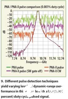 由于滤除了谱成分,窄带检波的优点是没有窄脉冲宽度限制,缺点是测量动态范围是占空比的函数。随着占空比的减小(即两脉冲之间的时间更长),平均功率减少,使信噪比(SNR)降低。这样会导致测量动态范围随占空比的减小而减小。这一效应称为“脉冲减敏现象”。在前几代脉冲VNA中,动态范围(单位为dB)的降低量可表示为20log(占空比)。通过增加新型的先进的脉冲检波方案,PNAX大大改善了接收器脉冲减敏现象。
