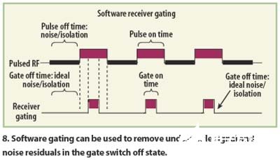 一种除去选通开关在关闭状态下不想要的残余谱的方法是使用软件选通(图8)。在VNA内部集成脉冲发生器的优点之一是“”精确的脉冲发生器时序是已知的,因而也可以准确地了解选通开关打开和关闭的时序。一旦数据被数字化,就可以有效地在数字数据上做时序标志,此数字数据对应于选通开关打开和关闭的时间。这样就能知道哪些数字数据成分对应于选通开关的导通状态,哪些成分对应于关闭状态。由于选通开关在关闭状态的残留谱只降低测量精度,所以将此数字数据设置为零,使此数字数据成为极好的无噪声无信号元素。由于极大地降低了SNR的噪声成分,这样可充分提高测量灵敏度。
