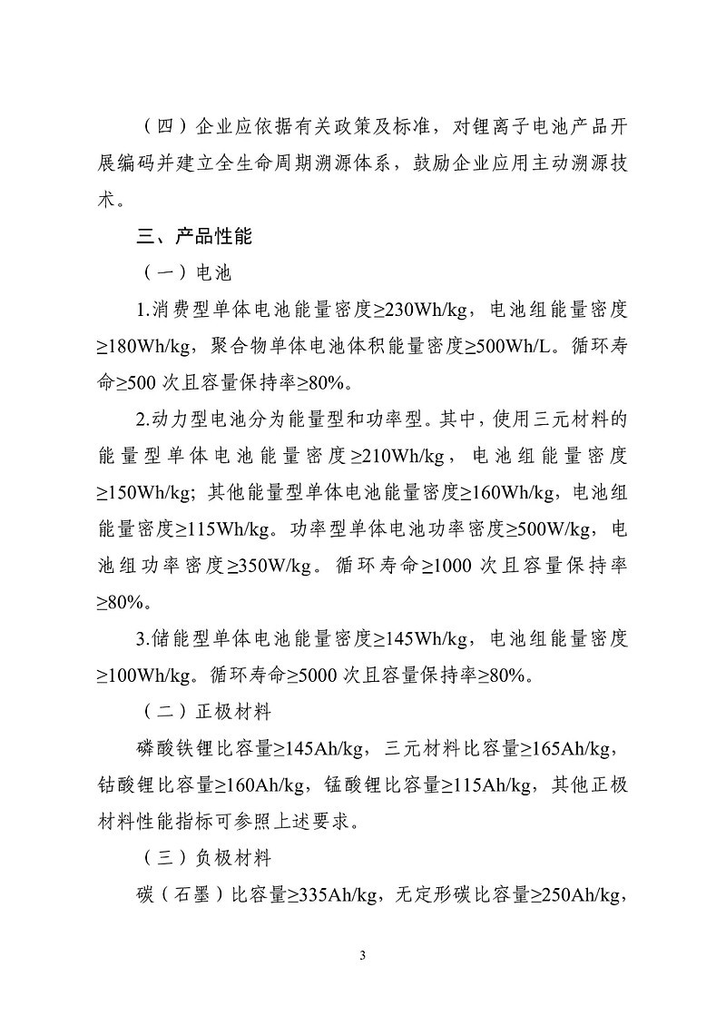 如:动力型电池方面,取消“能量型电池能量密度≥180Wh/kg,电池组能量密度≥120Wh/kg”,新增了对三元材料的单独指标要求(单体电池能量密度≥210Wh/kg,电池组能量密度≥150Wh/kg)。其他能量型单体电池能量密度≥160Wh/kg,电池组能量密度≥115Wh/kg。