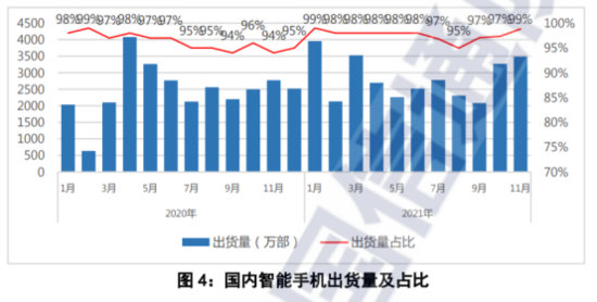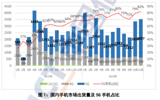 2021年1-11月,国内市场手机总体出货量累计3.17亿部,同比增长12.8%,其中5G手机出货量2.39亿部,同比增长65.3%,占同期手机出货量的75.3%。