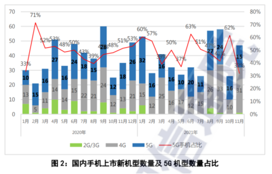 2021年11月,国内手机上市新机型47款,同比增长34.3%,其中5G手机15款,同比下降16.7%,占同期手机上市新机型数量的31.9%。今年前11个月,上市新机型累计427款,同比增长3.1%,其中5G手机203款,同比增长2.0%,占同期手机上市新机型数量的47.5%。