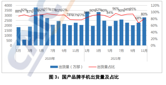 2021年11月,国产品牌手机出货量2804.1万部,同比增长23.6%,占同期手机出货量的79.5%;上市新机型43款,同比增长53.6%,占同期手机上市新机型数量的91.5%。2021年前11个月,国产品牌手机出货量累计2.75亿部,同比增长10.5%,占同期手机出货量的86.7%;上市新机型累计388款,同比增长5.4%,占同期手机上市新机型数量的90.9%。