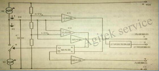 电路设计I2=2I1,当电子开关S断开,电路对外接电容C充电,当电子开关S接通时,电容C放电,所以在电容C上产生线性良好的三角波,经缓冲器由3脚输出。为了得到在比较宽的频率范围内由三角波到正弦波的转换,一个由电阻与晶体管组成的折线近似转换网络将三角波转换为正弦波,由2脚输出。而用于控制开关S的信号,及R-S触发器的输出,就是一方波,经缓冲器由9脚输出。