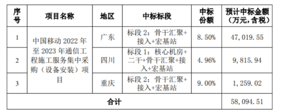12月13日,海格通信公告称,中国移动采购与招标网近日发布了“中国移动 2022 年至 2023 年通信工程施工服务集中采购(设备安装)项目”中标候选人公示,海格通信全资子公司广东海格怡创科技有限公司(以下简称“海格怡创”)为广东、四川、重庆,共 3 个地区中标候选人之一,预计整个服务周期中标框架合同金额约5.81亿元。