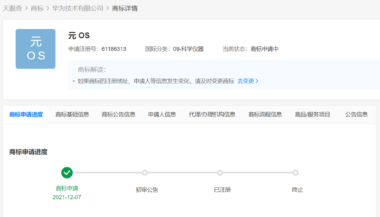 集微网消息,天眼查显示,华为技术有限公司近日申请注册“元 OS ”商标,商标国际分类涉 9 类科学仪器,目前商标状态为注册申请中。