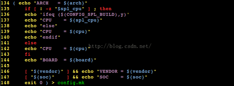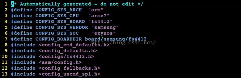 可以知道如果使用开发板board/ U-Boot.bin:二进制可执行文件,它就是可以直接烧入eMMC中的文件。 U-Boot : ELF格式的可执行文件。 U-Boot.srec : 摩托罗拉格式的可执行文件。 对于Exynos4412开发板,这里用的其实是Fs4412,执行“make fs4412_config"、“make all"后生成的u-boot-fs4412.bin可以烧入eMMC中执行。 一、U-Boot 配置过程 1、在顶层Makefile中可以看到如下代码: 假定在u-boot-2013.01的根目录下编译,则其中的MKCONFIG 就是根目录下的mkconfig文件(mkconfig是shell脚本文件)。 %_config是GUNmake语法层,表示的是所有以".config"结尾的文件。$(@:_config=)的结果就是将“fs4412"中的“——config”去掉,结果为fs4412。 MKCONFIG 就是执行mkconfig。 所以 “make fs4412_config"实际上就是执行如下命令: ./mkconfig fs4412 arm armv7 fs4412 samsung exynos 2、mkconfig 的作用 前面已经提到,mkconfig就是一shell脚本, 具体作用如下: a -- 解析boards.cfg fs4412相关数据 这是我们自行添加的.确定开发板名称BOARD_NAME。 b -- 针对平台作了一系列链接,创建到平台、开发板相关的头文件的链接。 c --创建顶层Makefile包含的文件 include/ config.mk inlucde / config.mk 内容如下: d -- 创建开发板相关的头文件inlucde/config.h Include/config.h导出结果如下: U-Boot 还没有类似Linux一样的可视化配置界面(比如使用 make menuconfig 来配置),要手动修改配置文件 inlucde/config/ 配置文件中有以下两类宏。 1) 一类是选项(Options),前缀为“CONFIG”,它们用于选择CPU、SOC、开发板类型,设置系统时钟、选择设备驱动等。 2)另一类是参数(Setting),前缀为“CFG_”,它们用于设置malloc缓冲池的大小、U-Boot 下载文件时的默认加载地址、Flash的起始地址等。 uboot 执行通过宏来判断:宏在头文件中定义。 #ifdef CONFIG_TEST run_test(); #endif 某头文件 #define CONFIG_TEST 可以这样认为,“CONFIG_”除了设置一些参数外,主要用来设置U-Boot的功能、选择使用文件中的哪一部分;而“CFG_”用来 设置更细节的参数。 二、U-Boot 的编译、链接过程 配uboot 编译通过Makefile来判断: obj-y += xx.o xx.o 在编译时,只编译obj-y obj-$(CONFIG_XX) = xx.o xx.o 如果CONFIG_XX为y,则此文件会被编译进u-boot.bin置完后,执行“make all” 即可编译: 找第一个目标all: 上面代码是对u-boot进行格式转换,变成二进制bin格式之后,再加一些校验与4412开如平台加密信息。 依赖u-boot: 先总结一下U-Boot 的编译流程: a -- 首先编译 cpu /$(CPU)/start.S,对于不同的CPU,还可能编译 cpu/$(CPU)下的其他文件; b -- 然后,对于平台/开发板相关的每个目录、每个通用目录都使用它们个字的Makefile生成相应的库; c -- 将a、b 步骤生成的.o .a文件按照 board / $(BOARDDIR)/config.mk文件中指定的代码段起始地址、board/$(BOARDDIR)/config.mk文件中指定的代码段起始地址、board/$(BOARDDIR)/U-Boot.lds链接脚本进行链接。 d -- 第c步得到的是ELF格式的U-Boot,后面的Makefile还会将它转换成二进制格式、S-Record格式。