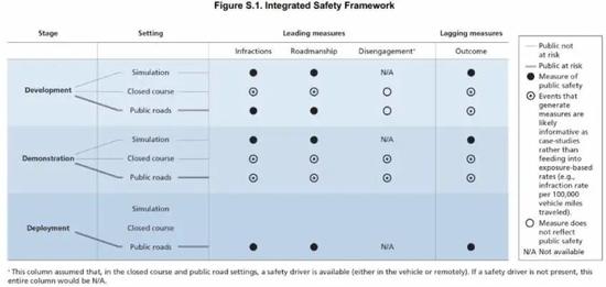 呈现了在不同环境(模拟、封闭场地、公共道路,有、无安全驾驶员)中针对不同阶段(开发、验证和部署)可以采用的安全衡量方法,