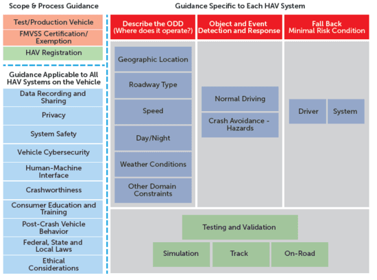 美国AV 3.0中提出了自动驾驶车辆开发、开放道路测试、应用相关最主要的安全要素,包括:系统安全、ODD(Operational Design Domain)、OEDR功能、Fallback(Minimal Risk Condition)、网络安全、数据记录、碰撞安全性(成员保护)、碰撞后处置(Post Crash)、自动驾驶车辆行为、验证与测试、人机界面(HMI)、用户教育与培训、联邦和当地法规。