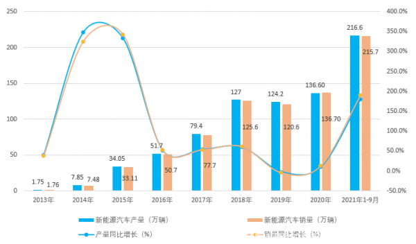 从中国汽车工业协会统计的数据来看,2013年我国新能源汽车产销规模均不足2万辆,之后在新能源汽车补贴政策加持下,新能源汽车产业飞速发展,产销量一年一个大台阶,2018年产销双双突破百万。之后随着补贴退坡,加上一些过剩产能逐渐退出市场,产销量以及增速在2019年和2020年迎来小幅回调,2021年,随着国家对“双碳”目标的确立,新能源作为清洁能源之一又一次站上了风口,新能源汽车产销明显提速,2021年1-9月的产销量均超过200百万,同比增速分别达到1.8倍和1.9倍。