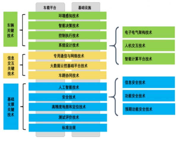 “三横”指车辆关键技术、信息交互关键技术与基础支撑关键技术,“两纵”指支撑智能网联汽车发展的车载平台与基础设施。
