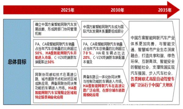 目标是到2035年,中国方案智能网联汽车技术和产业体系全面建成、产业生态健全完善,整车智能化水平显著提升,网联式高度自动驾驶智能网联汽车大规模应用。中国方案智能网联汽车关键核心技术处于国际领先水平,有效助推汽车产业转型升级、新兴产业经济重构和安全、高效、绿色的汽车社会文明形成,促进建设世界汽车强国的战略目标实现。