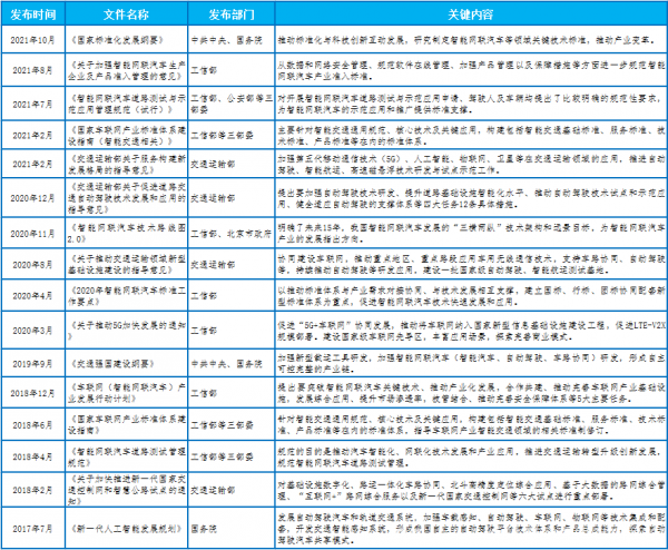 2021年10月,中共中央、国务院印发《国家标准化发展纲要》,提出要“推动标准化与科技创新互动发展,研究制定……智能网联汽车等领域关键技术标准,推动产业变革,适时制定……无人驾驶等领域技术安全相关标准,提升技术领域安全风险管理水平。”