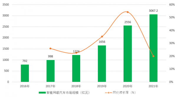 我国智能网联汽车行业虽处于发展的初步阶段,但整个市场规模迅速攀升,据iResearch统计的数据看,2016-2020年,我国智能网联汽车行业市场规模从不足800亿元增长至2500亿元以上,年均复合增长率达到34%以上,尤其是2020年实现了超过50%的增长率。