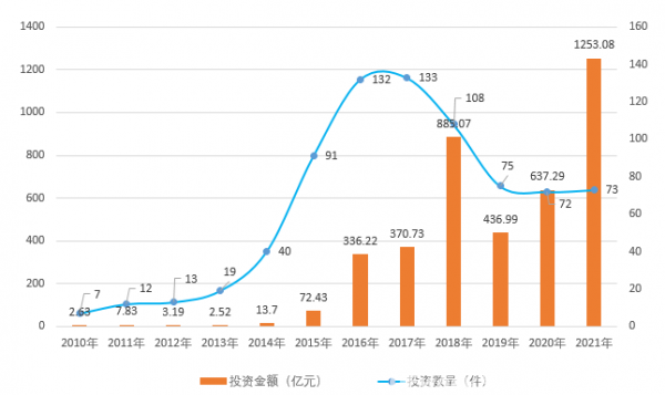 以IT桔子的统计数据为例,以“车联网”为关键字进行搜索,自2010年以来,我国智能网联汽车行业共发生775件投融资事件,事件发生最多的年份集中在2015年以后,2015-2021年共发生684件,占比高达88.3%。2016年以来,每年的投资金额均在300亿元以上,尤其是2018年和2021年投资金额均在800亿元以上,2021年突破1000亿元,达到1253亿元。