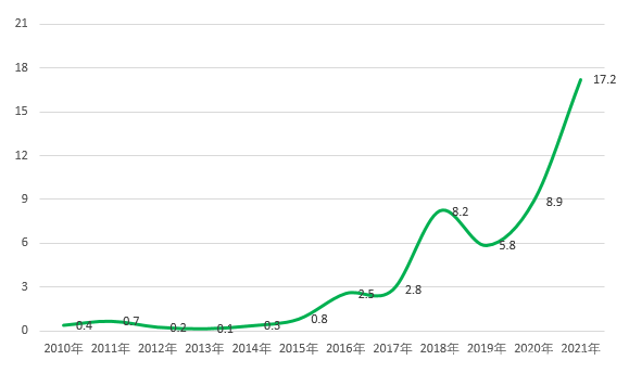 根据投资数量和投资金额,我们整理出2010年以来智能网联汽车行业投融资事件的单笔金额情况,2010年还仅为0.4亿元,随后几乎是逐年递增,2021年达到17.2亿元。在此基础上,威马汽车、哪吒汽车、理想汽车、零跑汽车、魔门塔、文远知行等一大批独角兽企业顺势崛起,为智能网联汽车领域增添了新的发展势力。