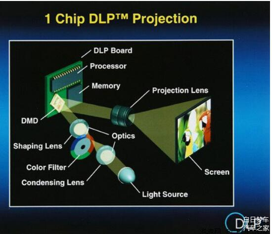 DLP机构的主要包含:光源、颜色管理系统、散热系统、照明及投影元件。光源通滤色、裁剪后照射到DMD芯片,DMD芯片是一个包含上百万反射镜面的半导体光开关,接受处理数字信号(下图中0/1),通过这上百万的反射镜面反转投影,实现百万级别像素的呈像。