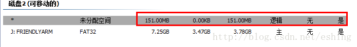 Lcd.c中的lcd_draw_bmp()绘图函数我进行了修改,让他的更加灵活一点,它可以绘制由网上比较流行的图片转LCD数据软件“img2lcd”转换出来的,带有8字节图片信息头的字符数组文件。此函数会自动从8字节的信息头中提取图像高度和宽度信息,然后进行绘图。由于我现在提供是800*480的24bit的图片,现在编译生成的user_bin.bin文件会比较大了,现在出来的文件大小已经比较大了,大约有1149K了,所以我们有必要修改一下BL2中mmc_relocate.c,要将其复制的扇区大小改大一些,一个扇区512字节,大家看着自己程序修改吧,但也不能太大了,因为我不清楚FriendlyARM为我们提供的SD-Flasher.exe在格式分区时,第一分区分配大小到底有多大,我不是很确定,我用一个分区工具查看时,发现在大小有150M左右,如下图9-1所示,大家的程序还是控制在5M大小内比较保险吧。