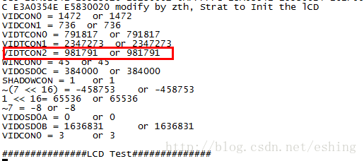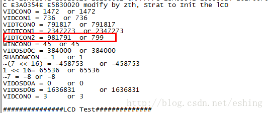 串口助手中不但显示了前面从内存中读出的信息,同时也输入了LCD初始化过程中增加的打印信息,我截取了部分输出如下图9-2所示,从图上可以看出VIDTCON2寄存器的初始化值两种风格设置数值果然不同,这就是问题的所在。