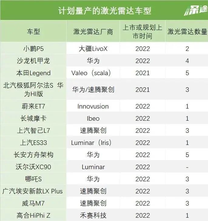 2022年内上市的搭载激光雷达新能源车多达12款。几乎所有已知的电动车品牌都加入了这场军备竞赛。北汽极狐阿尔法S、小鹏P5、蔚来ET7、上汽RS33、智己L7等等新车都预告了激光雷达的上车。