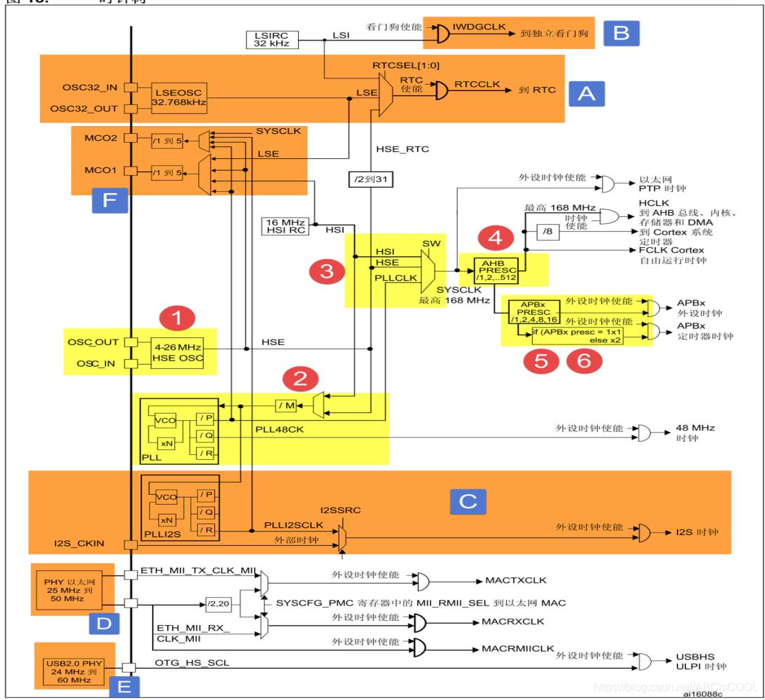 1–6部分为主系统时钟,A~F为外设和其他时钟