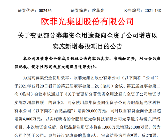 12月21日,欧菲光发布公告称,拟使用募集资金向全资子公司合肥晶超光学科技有限公司(以下简称“合肥晶超”)增资2亿元,同时以自有资金向合肥晶超增资4000万元,以实施新增的合肥晶超光学科技有限公司光学镜片与镜头产线项目。