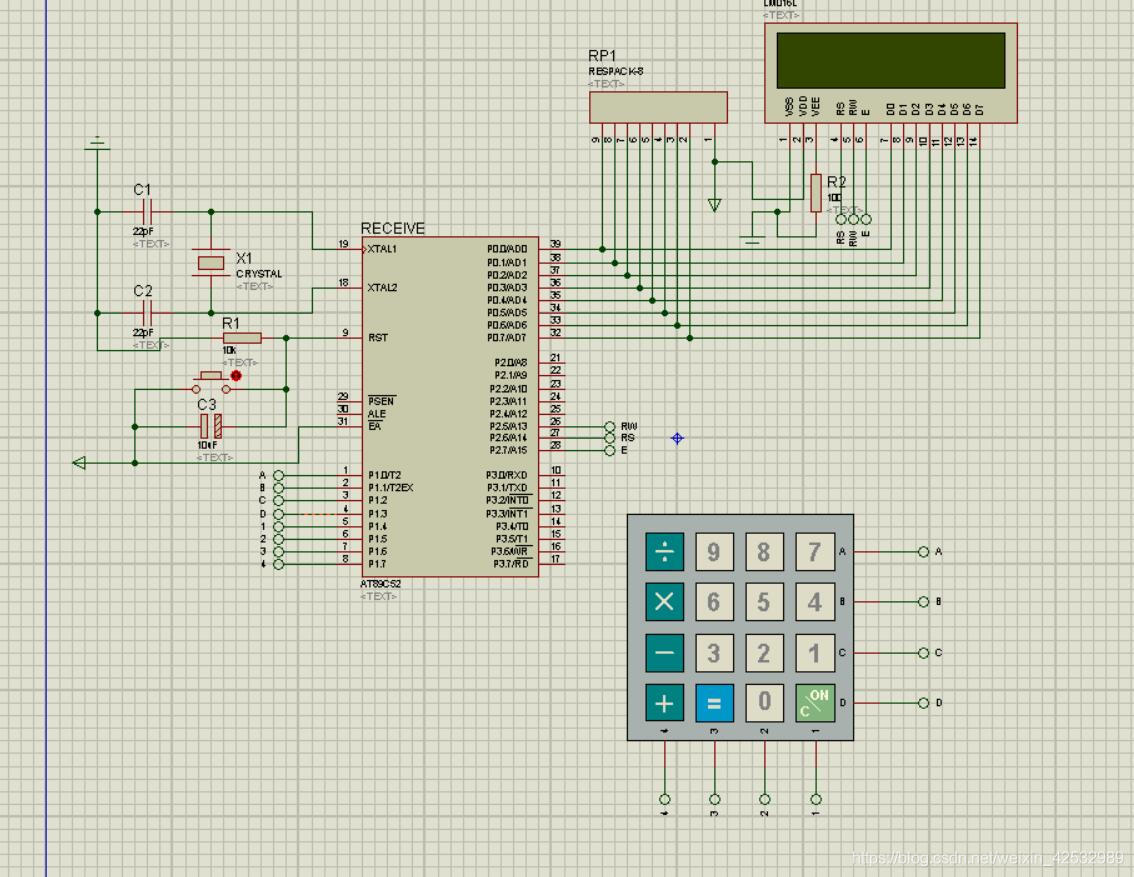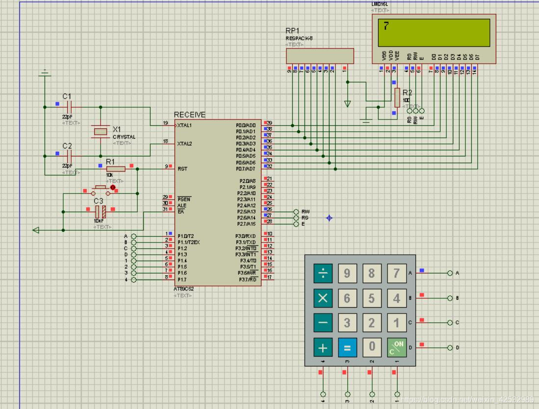昨天研究了矩阵按键在proteus7.8上的仿真问题,今天直接上个实例,用LCD1602显示在计算器上按下的按键字符。