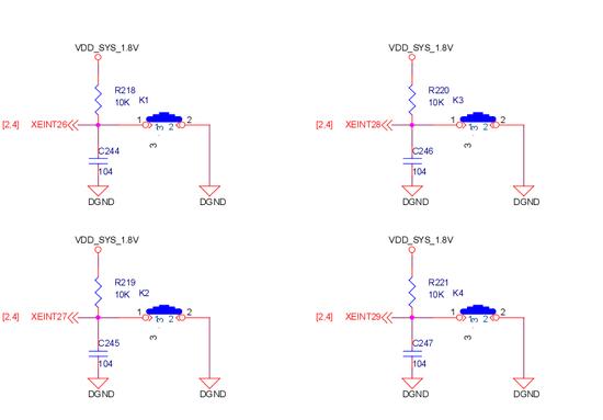 按键驱动跟之前的LED,蜂鸣器的方法类似;通过底板,核心板我们可以看到按键的电路图: