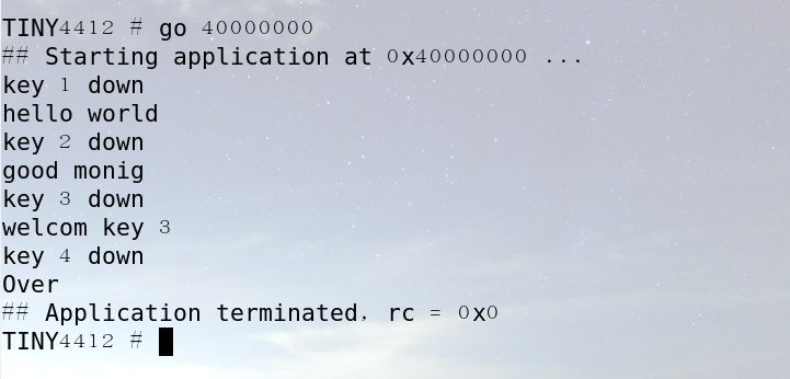 有芯片手册可知:GPX3CON为0为检测,GPAC3DAT为1是高电平下面贴出代码:按键KEY1,KEY2,KEY3分别控制输出字符串,KEY4控制退出: