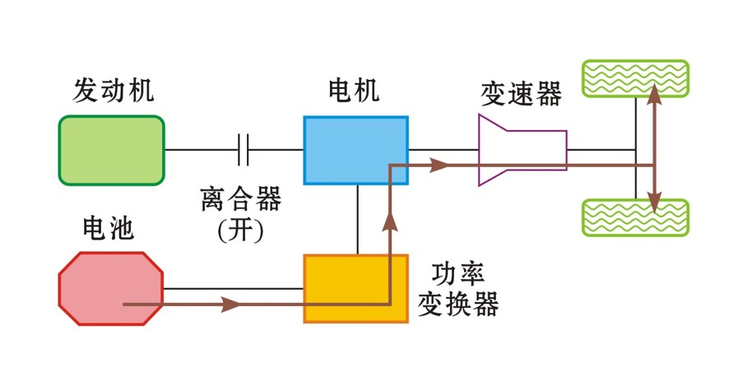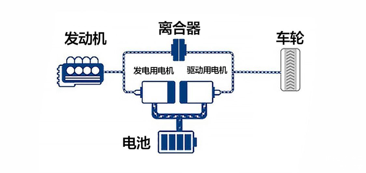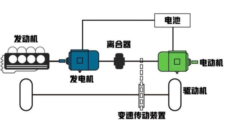 串联式混动有一个喜闻乐见的别名,增程式混动,发动机并不直接介入行驶,而是拖动发电机在电池电量不足或功率不足时发电,最终驱动车辆行驶。