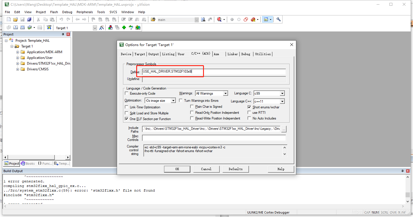 STM32F103xB 宏:为了告诉 STM32HAL 库,我们使用的芯片类型是 STM32 型号是小容量的,使 STM32HAL 库根据我们选定的芯片型号来配置。