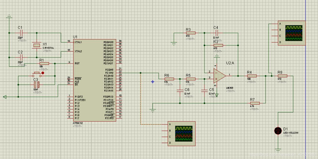 #include sbit Square=P1^5; //设置方波输出引脚P1^5 void main(void){ TMOD=0x02; //配置TMOD:定时器,工作方式2(自动重装初值) TH0=0x06; //方式2,预装值 TL0=0x06; //方式2,计数器 IE=0x82; //配置IE:中断允许/*也可以位操作,写成EA=1,ET0=1*/ TR0=1; //配置TCON:位操作,T0的中断标志位 while(1); //死循环,等待中断 } //这里没有其他中断服务程序,因此没有配置IP中断优先级 void time0_int(void) interrupt 1{ //定时器中断服务程序 Square=!Square; } 结构图如下: 上面是一个很简单的例子,但由此我们可以归纳出定时器的使用方法和步骤: 1、初始化定时器 (1)配置TMOD,TMOD的作用如下 (2)设定THx、TLx的值。需要注意的是除了在工作方式2外。其他的工作方式下,这两个值要在定时器的中断服务函数中重新装入。 (3)设置IP,即中断优先级(不需要的话就不用设置的) (4)开中断:总中断允许和定时器T0/T1的中断允许 (5)打开定时器的中断标志位TRx(直接位操作即可) 这样就完成了定时器的初始化,接下来写一下中断服务程序即可 下面再讲两个实例: 实例二:PWM调直流电机速度 仿真图:图中K1是加速键,K2是减速键 代码如下: //控制直流电机转速 #include #define uint unsigned int sbit Power=P1^0; //启停控制,Power=0电源断开,Power=1电源接通 sbit JiaSu=P1^1; //加速键 sbit JianSu=P1^2; //减速键 unsigned char PWMH; //高电平保持时间(以定时器定时时间的倍数计算) unsigned char PWM; //PWM的整个周期(也已定时器定时时间的倍数计算) unsigned char Counter; //定时器定时时间计数器 void INTT0() interrupt 1{ //每溢出一次来判断一次 Counter++; //计数值加1 if((Counter!=PWMH)&&(Counter==PWM)){//不在PWMH高电平时间,并且一个PWM的周期也到了 Counter=1; //计数值复位 Power=1; //开电源进入下一个PWM的周期,拉高电平 }else if(Counter==PWMH){ //高电平时间结束了,拉低电平关电源不供电 Power=0; } } void main(void){ PWMH=0x04; //设一个高电平的保持时间4/15(暂时定为2倍定时时间) Counter=0x01; //定时时间计数值,设初值为1 PWM=0x15; //一个脉冲周期,暂定15倍定时时间 TMOD=0x02; //定时器0在模式2下工作 TL0=256-200; TH0=256-200;//200us产生一次溢出,即200us为一个定时时间 ET0=1; //开定时器0中断使能 EA=1; //开总中断使能 TR0=1; //开始计时,定时器的中断标志位 while(1){ if(JiaSu==0){ PWMH++; //扫描按键K1 ,加速 while(!JiaSu); //这个很重要,判断开关是否断开 } if(JianSu==0){ PWMH--; //扫描按键K2 ,减速 while(!JianSu); //这个很重要,判断开关是否断开 } } } 这个自己运行一下仿真就知道啦!!! 实例三:PWM控制LED模仿呼吸灯(这个是我从普中上搬下来的,勿喷啦) 代码如下: #include #define uint unsigned int #define uchar unsigned char sbit PWM=P2^1; //定义使用的IO口 bit DIR; //用于改变方向的,1:PWM高电平延长;0:PWM高电平减短 uint count,value,timer1; //count:起到计数(一个缓冲的作用,延时一段时间在让value与timer1比较) timer1:整个PWM的周期 value:起到一个PWM波高低点交替点的作用,与timer1比较:timer1 void Time1Init(){ TMOD|=0x10; //选择定时器1模式,工作方式1,仅用TR1打开启动 TH1=0xFF; TL1=0xFF; //1us ET1=1; //打开定时器1中断允许 EA=1; //开总中断 TR1=1; //打开定时器 } void main(){ Time1Init(); //定时器1初始化 while(1){ if(count>100){ count=0; if(DIR==1){ value++; } if(DIR==0){ value--; } } if(value==1000){ DIR=0; } if(value==0){ DIR=1; } if(timer1>1000) {//PWM周期为1000*1us timer1=0; } if(timer1 }else{ PWM=0; } } } void Time1(void) interrupt 3 { TH1=0xFF; TL1=0xFF; //1us,重装初值 timer1++; count++; } 运行一下,就能看出仿真结果,但我觉得这个仿真的结果不是很好,还不如看一下它示波器的变化。