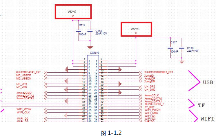 2)底板上 CON10(与核心板的连接座)上的 1,2,3,4,5,6 引脚的 VSYS 默认是给核心板提供 5V 电压,如下图 1-1.2所示: