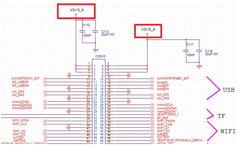 需要把 CON10 的 1,2,3,4,5,6 这几个引脚改成 VSYS_K,给核心板提供 4V 电压,如下图
