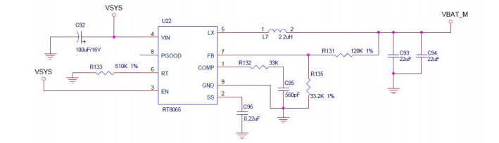 电源芯片 RT8065 提供 5V→4V 电源,给核心板电源芯片 8707 供电。核心板供电部分如