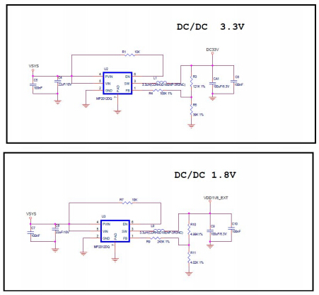 电源芯片 MP2012DQ 提供 5V→3.3V 和 5V→1.8V 电源,给大部分外围模块供电。