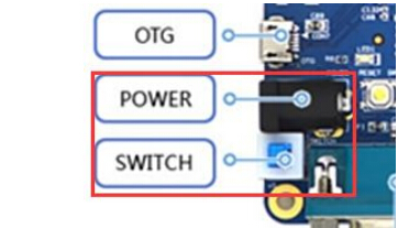 如下图所示 ,电源接口、电源开关、电源指示灯底板上的位置。