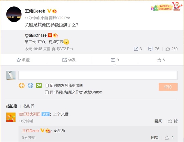realme副总裁、realme全球产品线总裁王伟在与网友互动式透露,realme GT2 Pro采用3K分辨率、第二代LTPO显示屏,这将是realme史上屏幕最好的高端旗舰。
