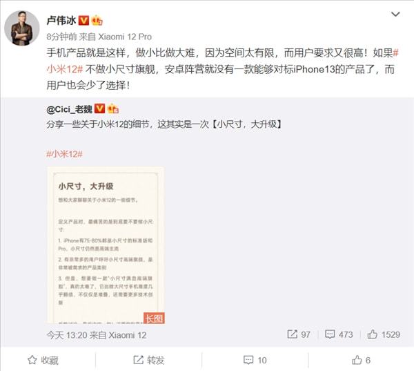 卢伟冰发微博表示,手机产品就是这样,做小比做大难,因为空间太有限,而用户要求又很高!如果小米12不做小尺寸旗舰,安卓阵营就没有一款能够对标iPhone13的产品了,而用户也会少了选择!
