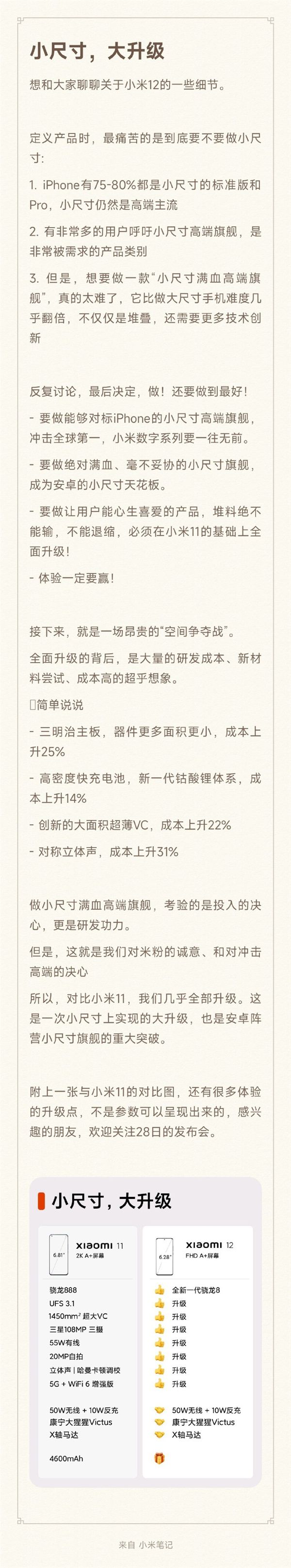 所以,小米12要做绝对满血、毫不妥协的小尺寸旗舰,成为安卓的小尺寸天花板。