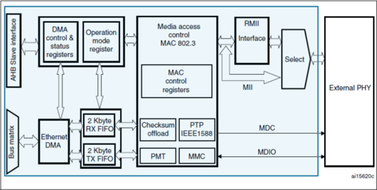 需要注意的是,这里的 DMA 是以太网外设专用的,它包含两个 FIFO 缓冲区,分别用于以太网数据帧的接收和发送,大小均为 2K 字节。