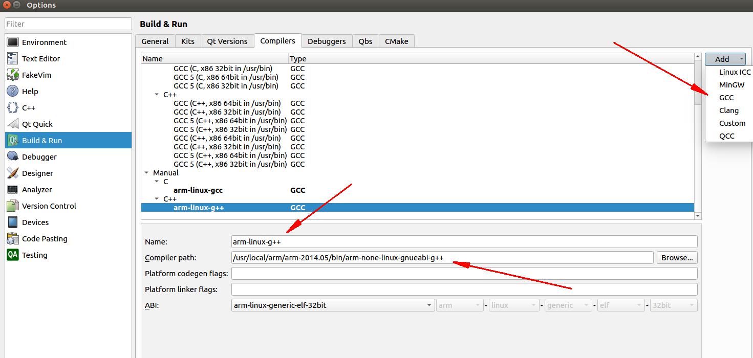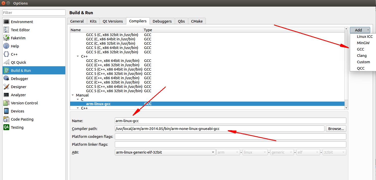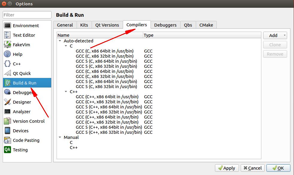 点击Build&run,并选择Compilers,如下图所示: