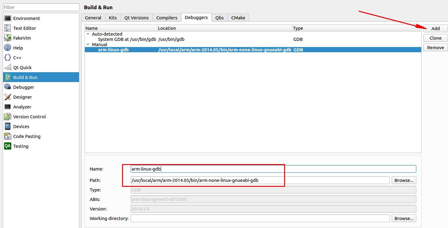 点击debuggers,选择add,在path路径里面我们选择2014.05的gdb,name起名为arm-linux-gdb,设置完成后点击apply,如下图所示: