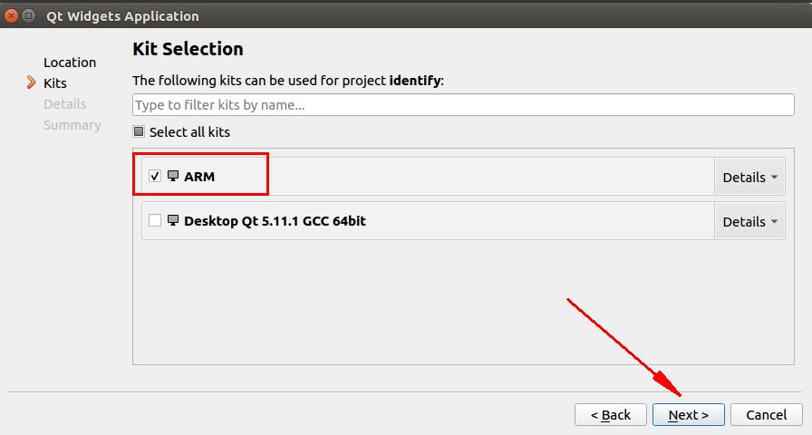 编译套件选择我们刚刚添加的arm,设置好以后,点击next,如下图所示: