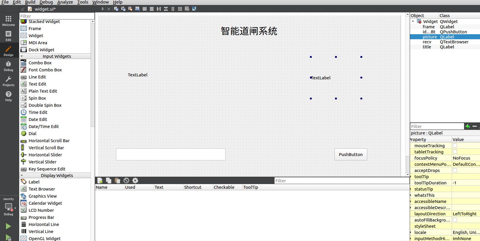 设计UI,添加三个label,一个按钮,一个消息框,为了简单,我们就不布局了,所以qwidge的大小我们要设置成和屏幕分辨率大小一样,这里我使用的是金属壳7寸屏幕,所以我这里设置成了1024*600。