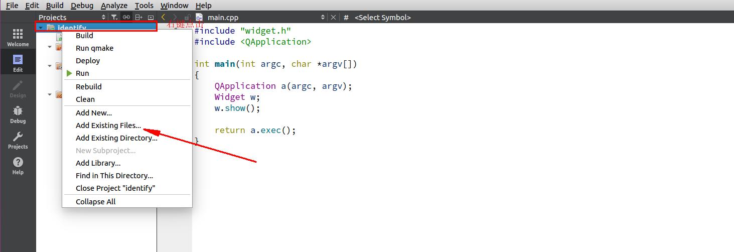 然后右键点击qtcreator中我们的新建的工程,选add existing files,如下图所示: