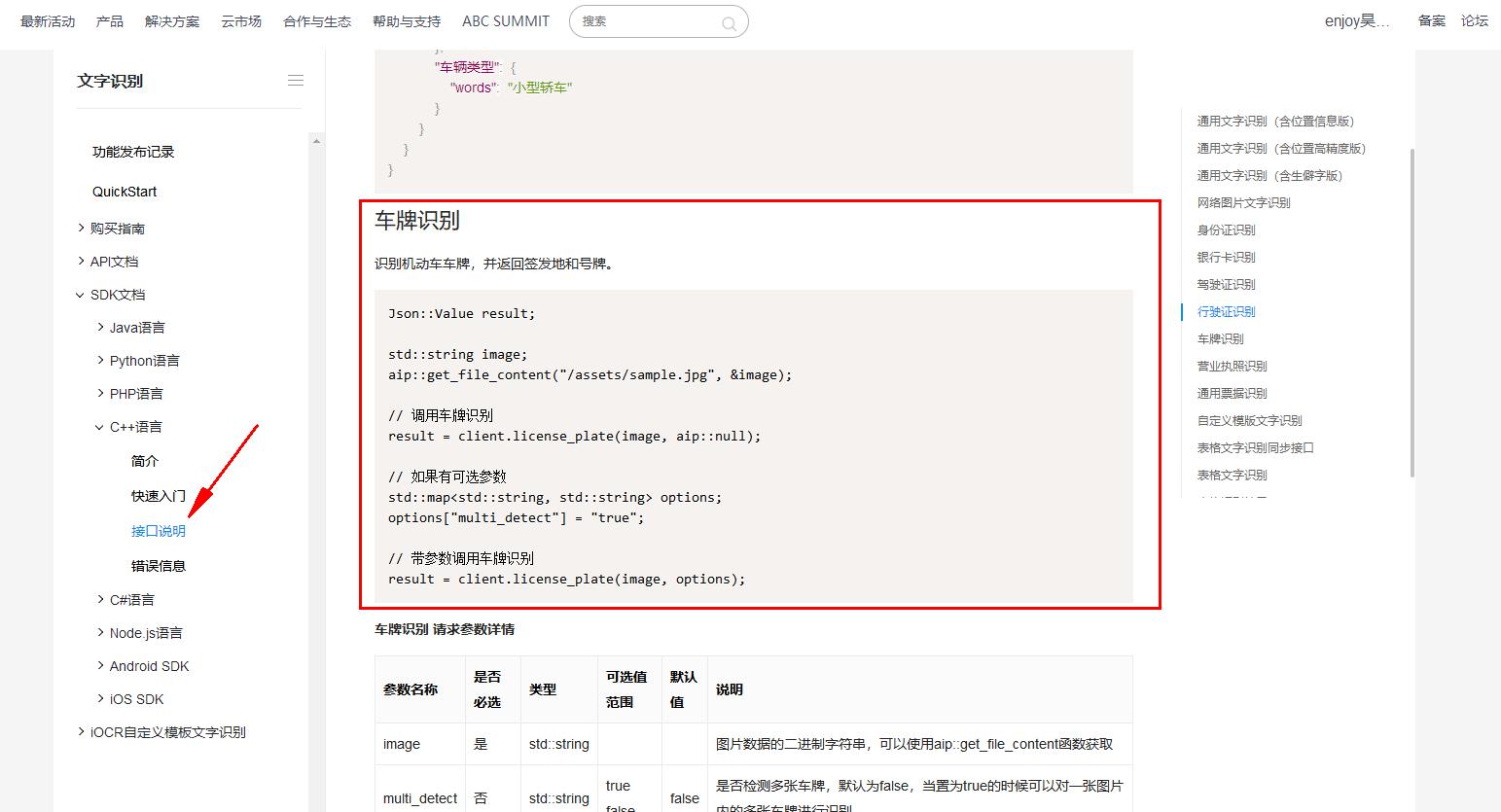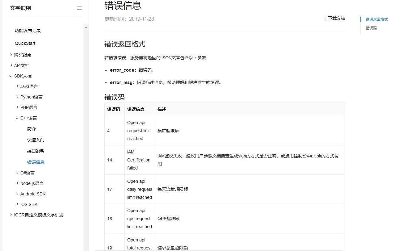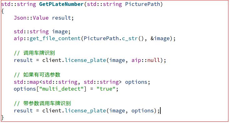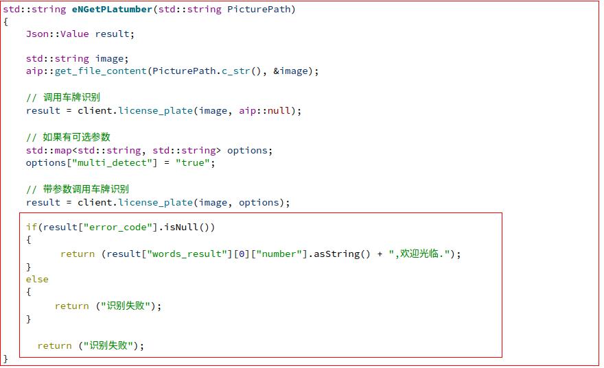 // 如果有可选参数 std::map options["multi_detect"] = "true"; // 带参数调用车牌识别 result = client.license_plate(image, options); 添加完如下图所示: 判断返回值和错误信息,返回格式如下: 错误信息如下: 判断返回值代码: if(result["error_code"].isNull()) { return (result["words_result"][0]["number"].asString() + ",欢迎光临."); } else { return ("识别失败"); } return ("识别失败"); 我们把判断返回值代码写到我们上面新建的std::string eNGetPLatumber(std::string PicturePath)函数下面:如下图所示: 至此,我们识别调用百度的接口的代码已经完成了。