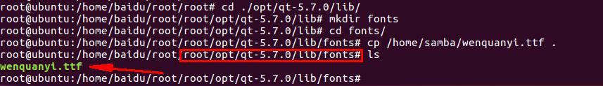 在跟文件系统的./opt/qt-5.7.0/lib/下使用mkdir fonts 创建一个存放字库的文件,然后将文件“wenquanyi.ttf”拷贝到根文件系统的“./opt/qt-5.7.0/lib/fonts”,如下图: